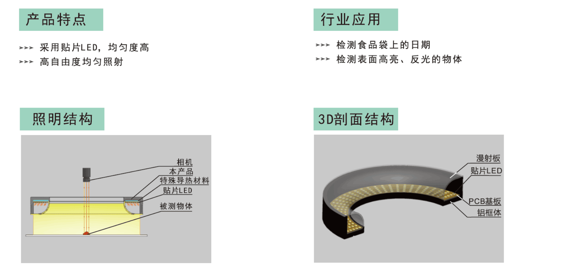 環(huán)形無影光源在環(huán)形光源的基礎上增加了特制的漫射板,使LED發(fā)出的光都被有效的利用,實現高亮度、高均勻性的照明效果。